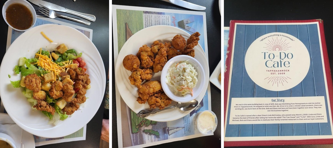 The only reason this is five stars is because Google doesn't allow six. To-do Cafe is an absolute home run! We started with pickle chips & Crab Bisque. Wife had Fried Oyster Salad; I had Fried Oyster Lunch Basket. Everything was excellent! We live in NoVA but will return here . . . just for lunch!